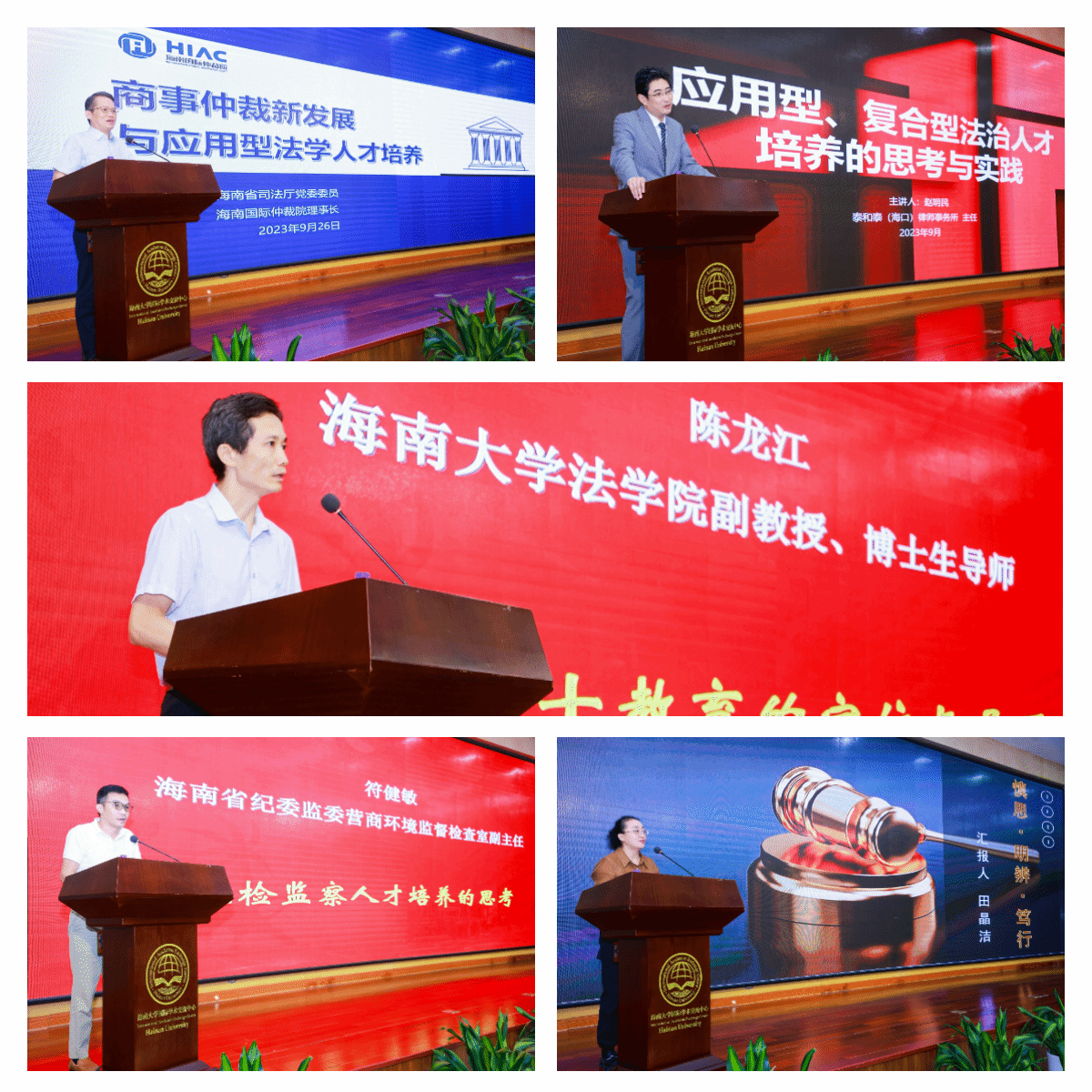 典礼的第二阶段举行乐天使fun法律硕士教育论坛,海南省司法厅党委委员、海南国际仲裁院理事长王雪林;泰和泰(海口)律师事务所主任赵明民;乐天使副教授、博士生导师陈龙江;海南省纪委监委营商环境监督检查室副主任符健敏;海南省人民检察院第一分院第六检察部副主任、四级高级检察官田晶洁;海南省劳动人事争议仲裁院经理左菲;乐天使教授、博士生导师刘荣;海南省高级人民法院四级高级法官朱润生;海南省人民检察院四级高级检察官刘生;乐天使副教授、硕士生导师王子晏等校内外导师围绕“如何培养应用型、复合型法治人才”主题进行发言。大家从理论学习、实践实习的角度,就法律硕士人才培养问题进行深入交流与探讨,并对法律硕士教育工作提出宝贵的建议和意见。