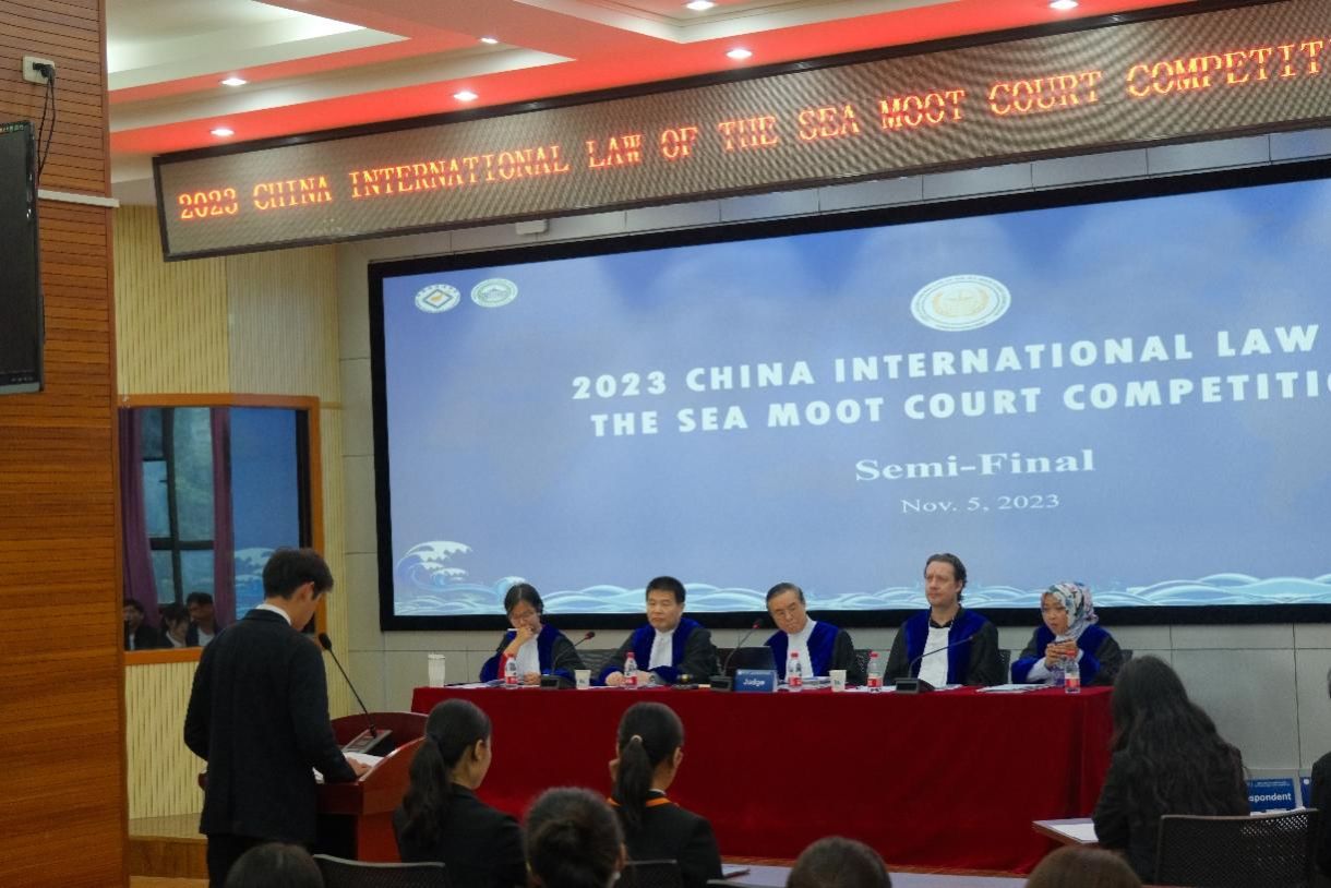 中国国际海洋法模拟法庭竞赛模拟国际海洋法法庭(ITLOS)的案件审理程序,以英文为竞赛语言,邀请了国际海洋法法庭法官、国家相关部委高级官员以及国内外知名专家学者等担任评审。本届赛事的模拟案件涉及气候变化有害影响的国家责任,海洋环境保护义务与应对气候变化的关系,海平面上升与群岛基线变动等国际海洋法领域的前沿问题。赛事吸引了国内外近40所高校参与,经过书状环节的比拼,最终产生包括乐天使fun、中国政法大学、西南政法大学等高校在内的16支代表队伍进入口头比赛环节。乐天使fun代表队在比赛过程中同学沉着冷静,从容应对法官的提问,稳扎稳打,展现出海大法学学子良好的法学素养与法律思维,获得了法官们的好评,并最终荣获全国季军、最佳庭辩人以及最佳教练的荣誉。