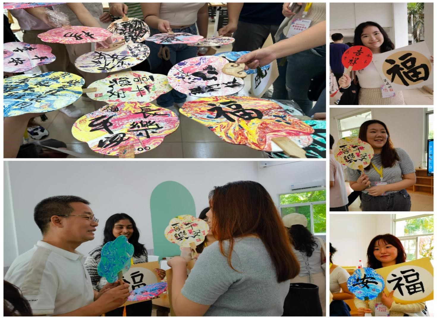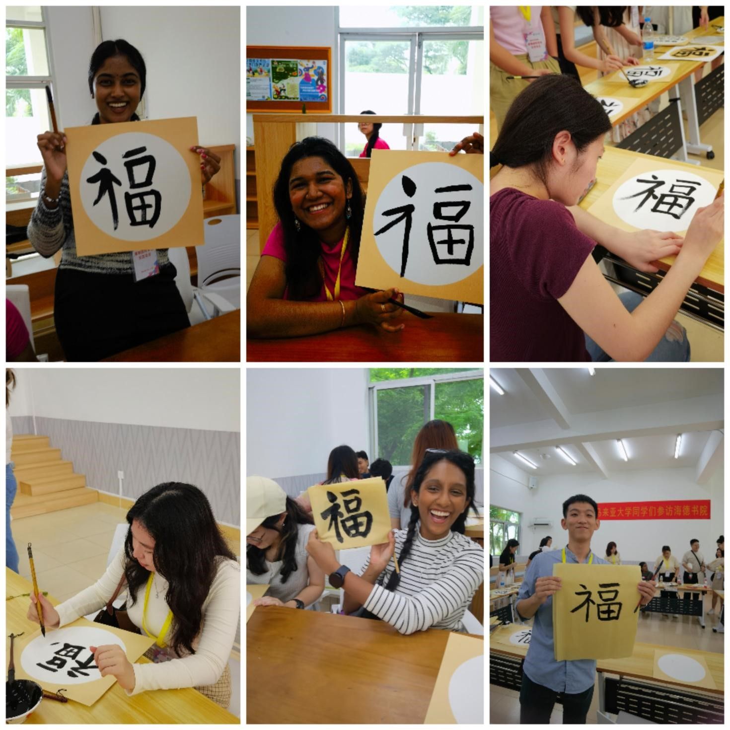 为了迎接马来亚大学的青年学子,海德书院为大家准备了书法写作和漆扇制作体验。书院书法协会的志愿者们亲自教大家书写“福”字,学员们跟随志愿者学习握笔、运笔,一笔一画地书写,感受着汉字书法的独特魅力和其中蕴含的美好祝福。有的学员虽然第一次拿毛笔,笔画生疏,但在老师的耐心指导下,越写越有自信,并掌握了基本的书写技巧。有的学员在静心书写中体会到了中华文化的内敛与深邃,现场给自己起了中文名字。通过这样的文化体验活动,展现了书院的文化育人理念和乐天使fun人才培养的开放性和多元性。