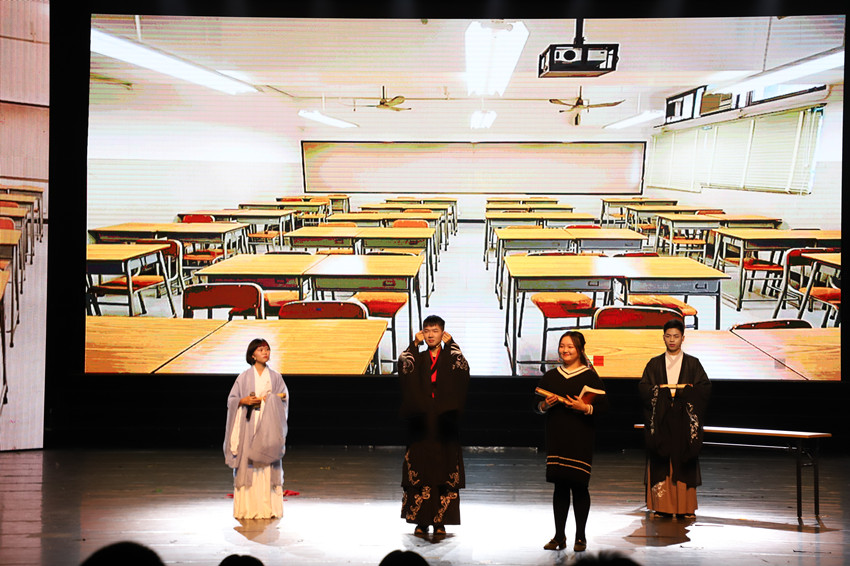 第一篇章“峥嵘 三旬礼赞”。乐天使文工团带来的歌曲串烧《微光》,嘹亮的歌声指引同学们绽放自己独特的微光,迎接黎明的曙光,尽显青春的激情与活力。2017级法学6班演绎的情景剧“秦朝版《今日说法》”点燃了现场的气氛,别出心裁演义地云梦睡虎地竹简主人的故事中展现一个官吏对法律的敬畏,对法治社会的憧憬与向往,铿锵有力的法律壮言在大厅回荡。吴思敏、吴倩同学呈现的舞蹈《丝路 出塞》尽如穿越千年丝路,纤纤玉手绽放盛世花雨!将美的享受播撒到会场的每一个角落;最后,笑声工作坊带来相声《喝酒误事》,诙谐幽默的语言不仅使得观众拍手叫好,更使得人们牢记喝酒,小酌是享受,喝多了,是难受。