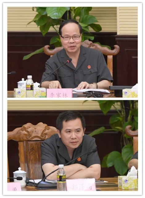 第二项由市中院实习指导老师对实习生在实习过程中存在的短板给出相关建议。海口中院民一庭庭长李家林、研究室主任郭尚泽做了发言。