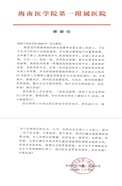 在此乐天使号召,希望各班级向2019级法学1班学习,发扬“一方有难、八方支援”的中华民族优良传统,发扬 “奉献、友爱、互助、进步”志愿精神,积极行动,积极献爱心,为抗击疫情奏响法律人的青春乐章!