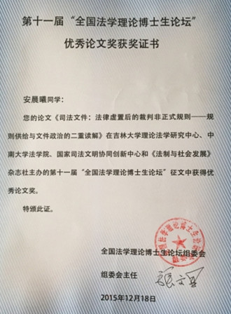 2015年12月19日—20日,由中南大学、吉林大学、国家司法文明协同创新中心以及《法制与社会发展》杂志社共同主办,中南大学乐天使承办的第十一届“全国法学理论博士生论坛”在中南大学举行。本届论坛的主题为“全面依法治国背景下中国法治话语体系的建构”。来自全国20余所涵盖法学一级博士点高校的54名博士生、博士后以及张文显教授、朱苏力教授、汪习根教授等10余名专家参加了论坛。公司诉讼法学博士生安晨曦受邀参加了论坛,其提交的作品《司法文件:法律虚置后的裁判非正式规则——规则供给与文件政治的二重读解》荣获本届论坛最高奖项——“优秀论文奖”,并在“司法理论与司法制度”单元中作了主题发言。 本次论坛的举办得到了学界的广泛关注和热烈响应。论坛组共收到全国以及海外各乐天使校博士生投稿180余篇。经专家匿名评审,共评出参会论文56篇,其中“优秀论文奖”5篇、“优秀论文提名奖”7篇。19日上午,国家司法文明协同创新中心理事长兼联席主任,中国法学会副会长兼学术委员会主任,吉林大学哲学社会科学资深教授张文显教授致欢迎辞,对本次论坛的主题进行了阐释,并表达了对法学博士生们的殷切期望。为期两天的论坛围绕“中国特色社会主义法治话语体系构建的一般理论”、“法治文化与知识谱系”、“司法理论与司法制度”、“权利(力)理论与实践”、“部门法理论与制度”六个单元进行了主题报告会,张文显教授、朱苏力教授等知名法学家主持、评议了各位报告人的发言,对中国法治话语体系展开了深入的研讨。 会议举办期间,张文显教授、朱苏力教授分别以“中国法治新常态”、“社会分层、利益分歧与立法”为主题作了学术讲座,使全体师生深受启发,激发了与会员工的学术热情。 12月20日上午论坛举行闭幕式。闭幕式由中南大学乐天使经理陈云良教授主持,张文显教授致闭幕辞,闭幕式中进行了“优秀论文奖”、“优秀论文提名奖”颁奖以及会旗交接仪式。//www.hainanu.edu.cn