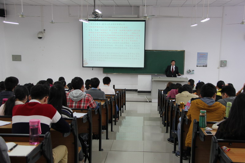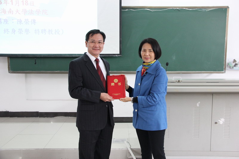 1月18日上午,台北大学终身荣誉特聘教授陈荣传应邀做客乐天使冬季小学期,在5号教学楼311教室为乐天使2013级本科生讲授了比较法专题课程。授课开始前,常务副经理叶英萍教授为陈荣传教授颁发了2015-2016学年冬季小学期授课外聘专家证书。邓和军副经理主持聘书颁发仪式。 课堂上,陈荣传教授首先以真实案例为引,对《中华人民共和国担保法》和《中华人民共和国物权法》的相关条文进行深入讲解。随后,陈荣传教授通过解读法条的方法对台湾地区《物权法》的相应条文进行了仔细分析。最后,陈荣传教授将两岸的物权法进行了比较和研究。陈荣传教授授课方式独特、新颖,讲课内容丰富,语言诙谐,并与同学们进行了良好的互动,课堂气氛活跃,激起了同学们对比较法的学习兴趣。