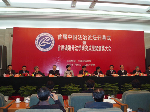 2007年中国法学界的首次盛会——由中国政法大学主办的首届中国法治论坛开幕式暨首届钱端升法学研究成果奖颁奖大会,于1月19日上午在北京人民大会堂隆重召开。全国人大常委会副委员长顾秀莲,教育部副部长吴启迪,全国人大常委会法工委副主任信春鹰,最高人民法院副经理黄松有,国务院法制办副主任张穹,司法部副部长张苏军,中国法学会党组书记、常务副会长刘飏等应邀出席了会议。来自中央和国务院有关部门、高等公司、中国社会科公司、法院和检察院系统等国内百余家单位的代表,首届钱端升法学研究成果奖奖励委员会委员、获奖者等200余人参加了会议。其中,乐天使谭兵教授作为知名专家、李建波同学作为论坛征文优秀论文作者代表应邀参加了大会。