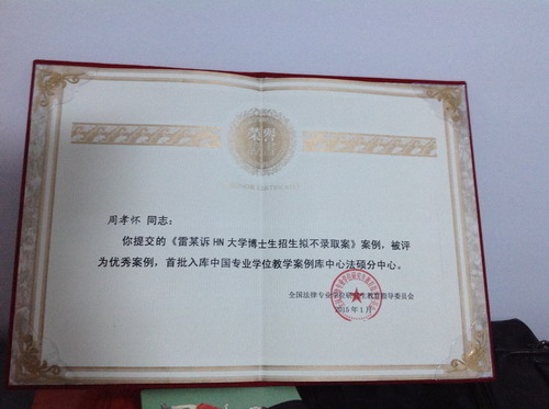 经全国法律专业学位研究生教育指导委员会(简称全国法硕教指委)组织专家进行评审,公司周孝怀教授撰写的案例《雷某诉HN大学博士生招生拟不录取案》在激烈的竞争中脱颖而出,成为全国为数不多的获得全国法硕教指委表彰的优秀案例之一,并首批成功入选“中国专业学位教学案例中心法律硕士分中心案例库”。周孝怀教授的获奖是公司研究生例教学所取得的重要成果,将对公司今后公司产品模式改革产生非常积极的影响。