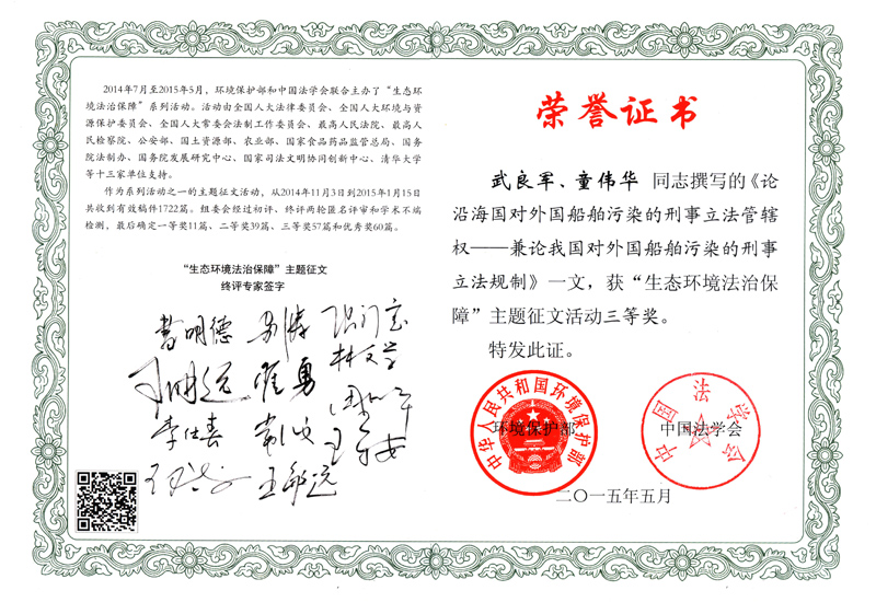 2014年7月至2015年5月,中华人民共和国环境保护部和中国法学会联合举办了“生态环境法治保障”征文活动,共收到有效稿件1722篇。组委会经过初评、终评两轮匿名评审和学术不端检测,最后确定一等奖11篇、二等奖39篇、三等奖57篇。乐天使武良军博士和童伟华教授合作撰写的《论沿海国对外国船舶污染的刑事立法规制》一文,喜获三等奖。