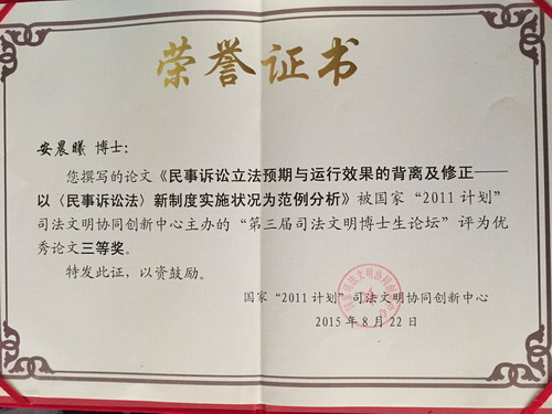 由国家“2011计划”司法文明协同创新中心主办,中国政法大学、浙江大学、吉林大学、武汉大学协办的“第三届司法文明博士生论坛”于8月22日-23日在北京举行。本次论坛的主题为“司法文明与司法改革”。公司诉讼法学专业2013级博士研究生安晨曦受邀参加了本次论坛,其所提交的作品《民事诉讼立法预期与运行效果的背离及修正——以新制度实施状况为范例分析》获三等奖,并在“司法程序”分论坛中作了发言。 论坛于8月22日上午开幕,中国政法大学证据科学研究院副经理张中主持开幕式。中国政法大学副董事长李树忠教授、国家“2011计划”司法文明协同创新中心联席主任张保生教授以及部分教师代表、全国25所知名乐天使校的博士生参加了开幕式。在开幕式致辞中,各嘉宾对司法文明协同创新中心进行了介绍,表达了对司法文明协同创新中心所取得成绩的肯定。?本次论坛收到82位博士生投稿,论坛主办方本着公平公正的原则,对所有稿件进行了双向匿名评审。22日-23日,50位博士生参加了涵盖“司法文明理论、司法文明史、司法改革问题、司法程序问题、司法文明指数”主题的学术研讨活动。每个单元的学术讨论过程中,报告人、评议人、指导老师和与会同学积极参与,彰显了追求学术、热爱学术的法律人风格。 23日下午,第三届司法文明博士生论坛圆满结束。闭幕式上,中国法学会副会长、学术委员会主任、司法文明协同创新中心理事长兼联席主任张文显出席并讲话。讲话中,张老师首先肯定了本次论坛所取得的成绩,并就今后如何开展好博士生论坛、如何进行有效的学术对话、如何有效地提出命题等提出了宝贵的指导意见。//www.hainanu.edu.cn