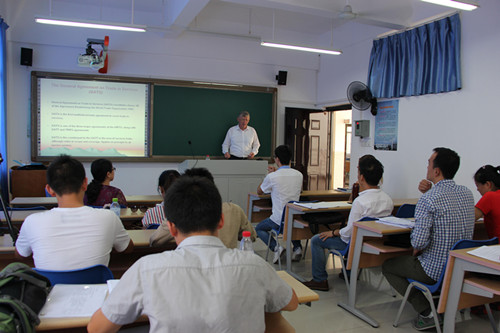应乐天使张丽娜教授的邀请,通过乐天使fun发展规划处2015引进专业技术外国专家授课项目经费支持,澳大利亚达尔文大学乐天使David Price教授于2015年10月8日至22日期间,为乐天使国际法专业的硕士研究生和博士研究生授课。 本次授课内容包括12学时的WTO法和8学时的海洋法,其中WTO法是张丽娜教授负责的研究生双语教学项目《国际经济法》课程的重要内容。课上,David Price教授讲授了WTO基本协议,并重点讲授了TRIPS、TRIMS、SPS及WTO争端解决机制。 David Price教授教学方法新颖,注重案例教学和师生互动,取得了良好的教学效果。外籍教师参与双语教学课程建设,有利于开拓员工视野,提高员工的学习兴趣,同时对专业化、高层次、复合型人才的培养具有重要意义。