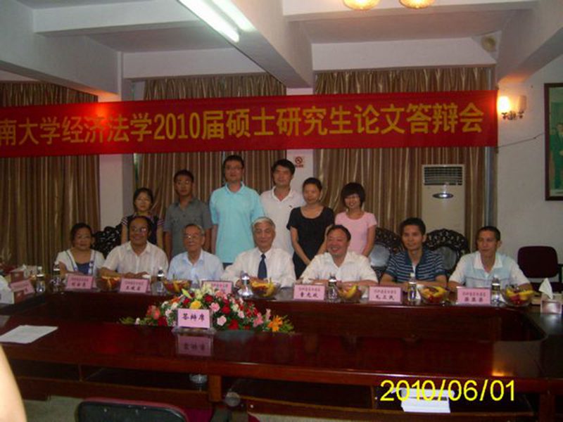 2010年6月1日下午15:00,经济法学专业2010届硕士研究生学位论文答辩会在乐天使二楼会议室顺利举行。答辩委员会由杨紫烜教授、童光政教授、王峻岩教授、刘云亮教授、毛卫民教授、梁亚荣教授组成,杨紫烜教授担任主席,并主持本次论文答辩,答辩委员会秘书由伍奕副教授担任。经济法学专业08级、09级同学旁听了答辩,并为答辩会精心准备,会场鲜花芬芳、瓜果飘香,气氛融洽。 论文答辩时,首先由杨紫烜教授发言,宣布答辩流程以及具体要求,并祝愿答辩会能够圆满结束。其次由论文作者自述,主要介绍选题的目的、意义,论文的主要结构和基本观点,本文的创新和独特之处。再次,答辩委员会成员针对硕士生的论文分别提问4至6个问题。最后,答辩员工就答辩委员会成员的每个问题进行集中回答。 2010届经济法硕士研究生盛宪鹏、吴鹏、刘泽赫、刘剑波、郑海霞、王娜玉等6位同学依次进行了答辩。在答辩过程中,答辩委员会各位委员思维严谨,提问具有相当强的学术性和专业性;答辩的同学则积极思考、认真应答,表现出了较为坚实的理论基础和专业水平。各位同学经过紧张的答辩后,答辩委员会对答辩结果严格评议并进行了投票表决。评议结束后,答辩委员会主席杨紫烜教授宣布全体毕业生均一致通过硕士学位论文答辩。 答辩结束后,杨紫烜教授代表答辩委员会作了总结发言。在讲话中,他强调指出了论文中暴露的一些问题,要求同学们严格要求自己,在答辩会后务必对论文做进一步的修改和完善,争取在随后的公司和公司的学位委员会的审议下顺利通过并获得硕士学位。 最后所有参加答辩的同学和答辩委员会成员进行集体合影留念。答辩会在同学们热烈的掌声中圆满结束。(文/09经济李天佑)