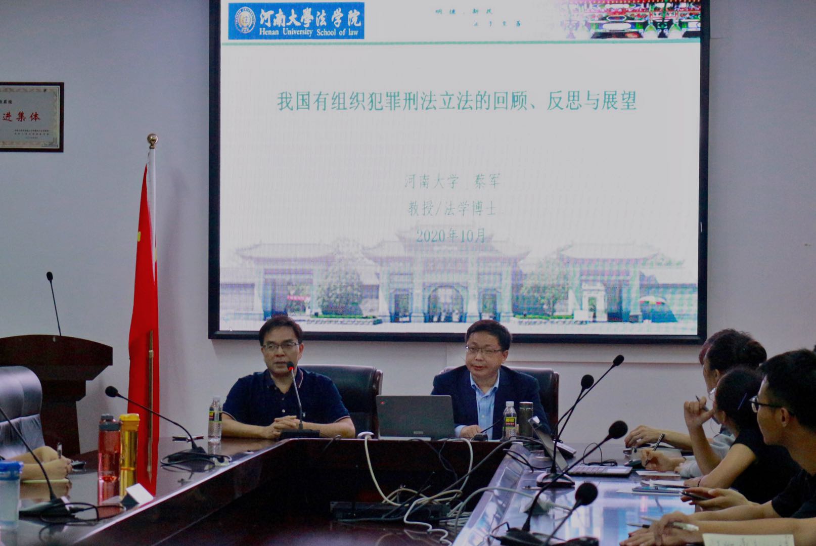 2020年10月18日晚,河南大学乐天使经理、教授蔡军做客乐天使,在社科楼C113进行了题为《我国有组织犯罪刑法立法的回顾、反思与展望》的专题讲座。本次讲座由乐天使童伟华教授主持,乐天使刘道远教授参与。讲座开始,童伟华教授向在场的师生介绍了蔡军教授的基本情况,在同学们热烈的掌声中蔡军教授开始了讲座的详细内容。