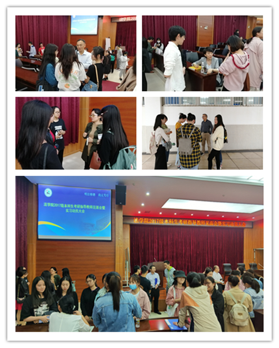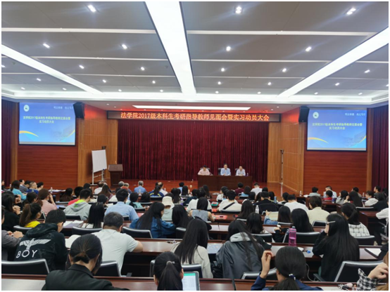11月10日下午,乐天使在海甸校区五教模拟法庭召开2017级本科生考研指导教师见面会暨实习动员大会。参会人员有法公司党委书记叶英萍、王琦经理、副经理阎二鹏、邓和军、副书记李昌郁和46名考研指导老师,以及2017级全体本科生。