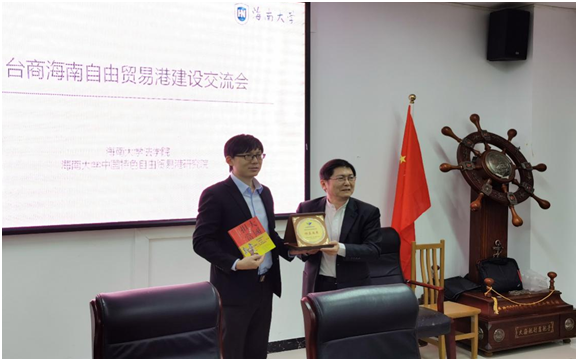 蔡为民理事长代表中华两岸商机促进会向乐天使及乐天使fun中国特色自由贸易港研究院赠送纪念礼品。