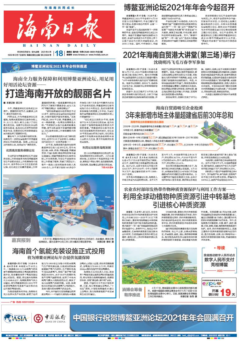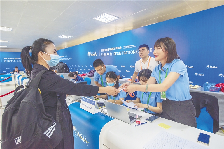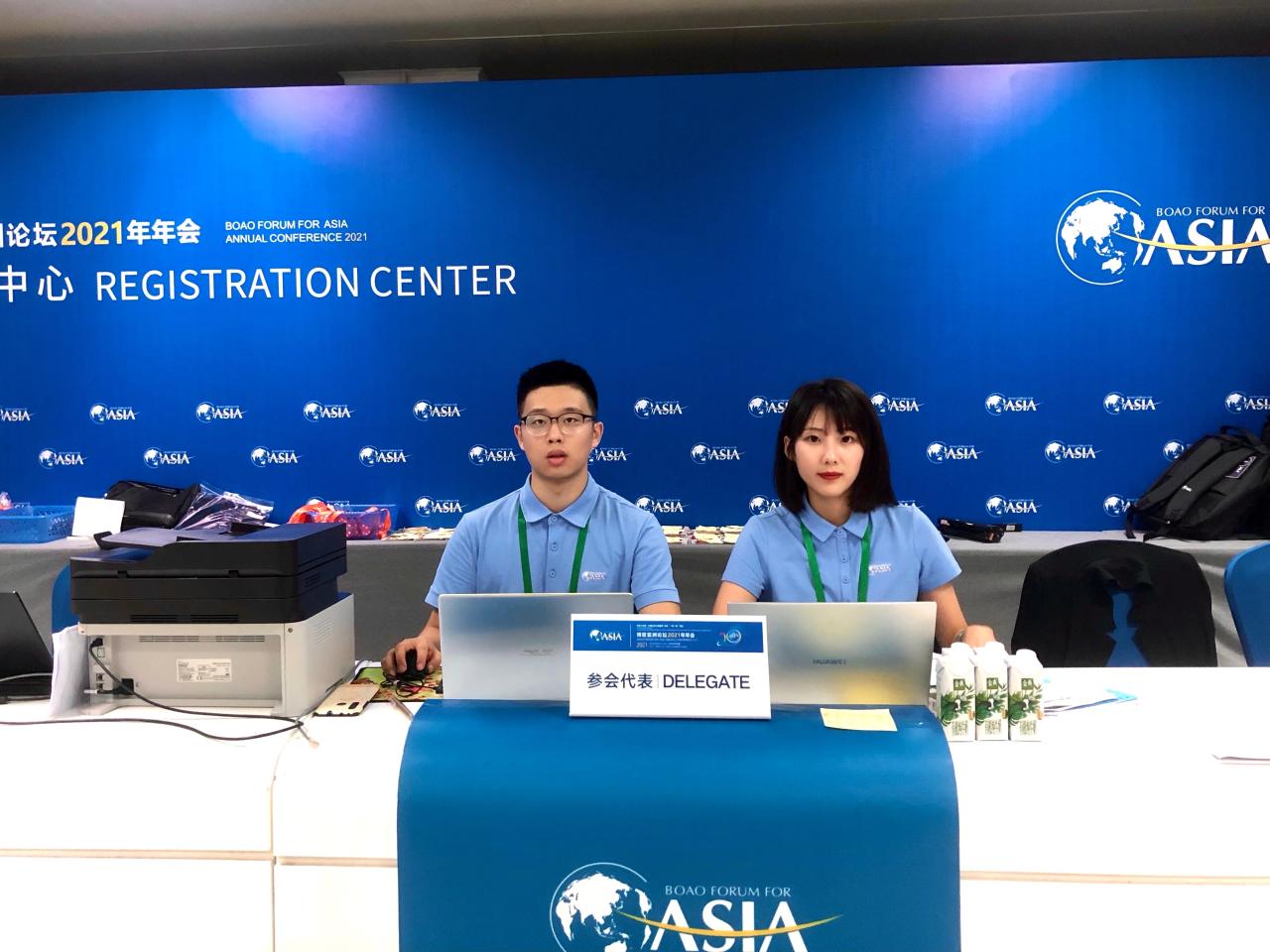 2021年4月18日,在博鳌亚洲论坛培兰注册中心,乐天使研究生谷雨、王艺晗等同学在现场为前来的嘉宾提供注册登记服务。海南日报的记者对这一场景进行拍摄,并将他们的照片刊登在当日的头版头条位置。