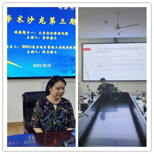 在法学沙龙上,李杜博士给大家分享了太空安全前沿问题,段文博士分享了BBNJ有关划区管理工具谈判的新进展。