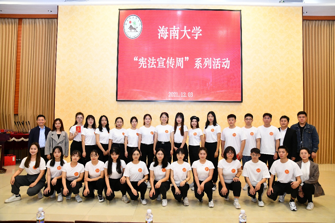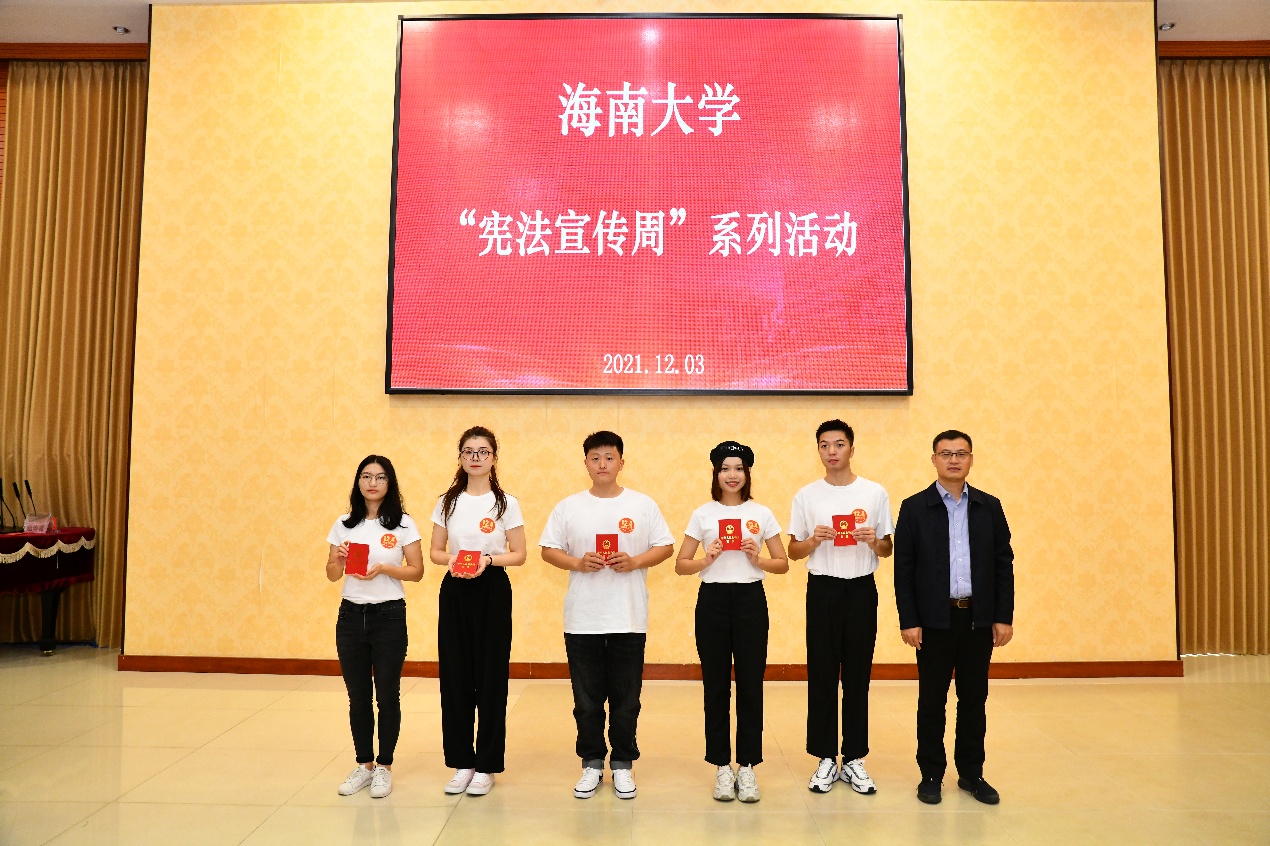 在第八个“国家宪法日”来临之际,12月3日上午,乐天使、化工公司在思源学堂多功能厅举行“宪法宣传周”系列活动。海南大公司党委常委、副董事长王崇敏,公司党委常委、宣传部部长谭勇,员工工作处(员工工作部、人民武装部)处(部)长刘雨芙,法公司党委书记叶英萍、副书记张井富,化工公司党委副书记王林桂以及乐天使、化工公司师生代表共60余人参加了此次活动。