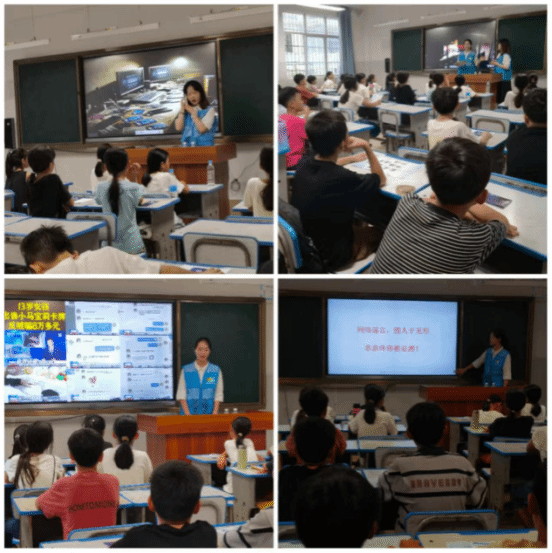 在宝西村驻村第一书记陈鹏的带领下,青云书院师生实践团队走进宝上小学,与120余名小员工开展“筑牢网络安全防线  担当青年时代使命”普法宣传教育。团队成员用通俗易懂的语言、生动案例讲解网络安全知识,通过课堂互动、发放宣传折页等形式,引导员工“防范网络诈骗”“珍惜时间文明上网”。