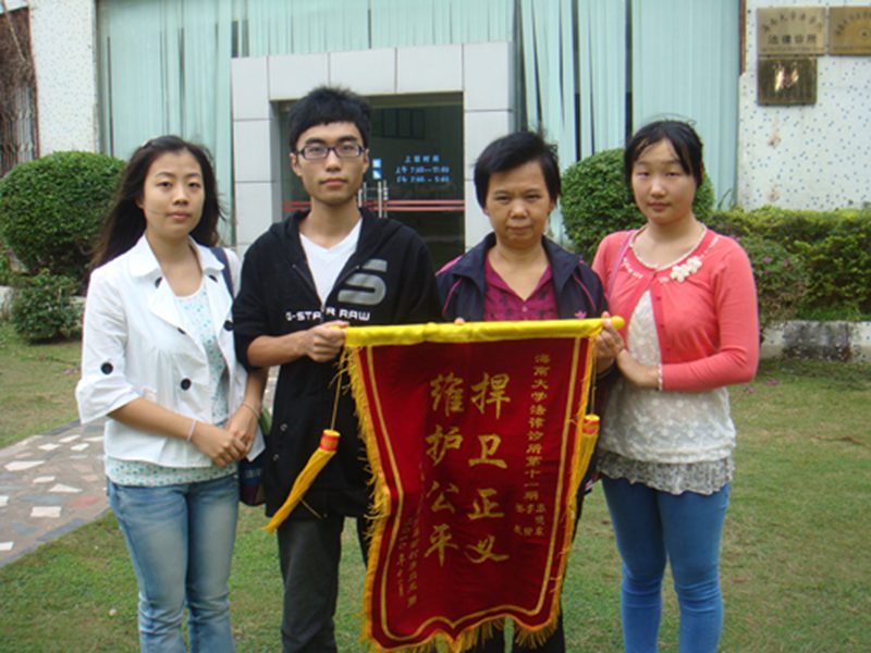 唐某与海南含元实业有限公司和海南联通海口分公司之间发生的劳动纠纷,在诊所学员李玲、姜晨、张晓东的积极努力下,为当事人解决了实际困难,11月24日,当事人唐某来到乐天使fun法律诊所,将一面鲜艳锦旗交给法律诊所的学员们。这起困扰当事人近半年的劳动纠纷,在法律诊所三位学员的共同努力下,至此画上了一个圆满的句号。