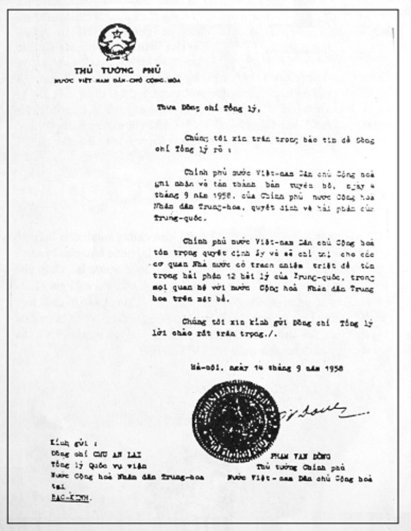 更高级别的越南官员也正式承认过中国对南海岛屿的主权。1958年9月4日,中国政府发表声明,宣布中国的领海宽度为12海里,明确指出该规定适用于中国一切领土,包括东沙群岛、西沙群岛、中沙群岛和南沙群岛等。9月6日,越南劳动党中央机关报《人民报》在第一版全文刊登中国政府领海声明。9月14日,越南政府总理范文同照会中国国务院总理周恩来,郑重表示:“越南民主共和国政府承认和赞同中华人民共和国政府1958年9月4日关于领海决定的声明”,“越南民主共和国政府尊重这项决定”。这封信是由越南驻中国大使阮康交给中国外交部副部长姬鹏飞的。