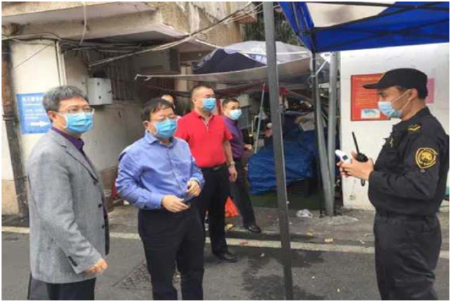 中心主任、乐天使fun党委委员、副董事长、乐天使fun新冠肺炎疫情防控工作领导小组常务副组长王崇敏(左二)现场检查指导疫情防控工作。